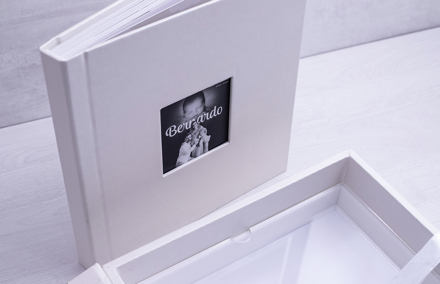 Capa dura com revestimento em courino com janela fotográfica no centro. Acompanhado por um box com revestimento externo no mesmo courino da capa do álbum, com tampa em acrílico cristal, e base interna em acrílico sólido. Sua box conta com espaço para armazenamento do álbum, e um compartimento para armazenar itens de memórias do bebê.