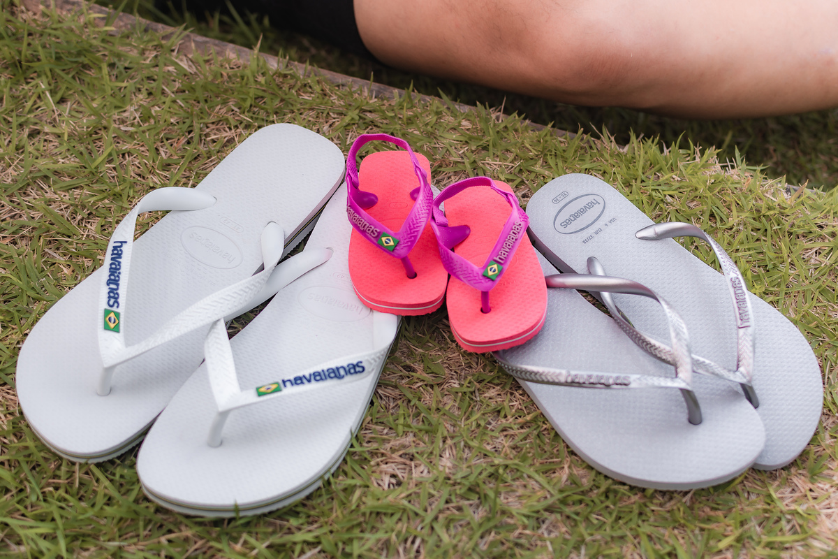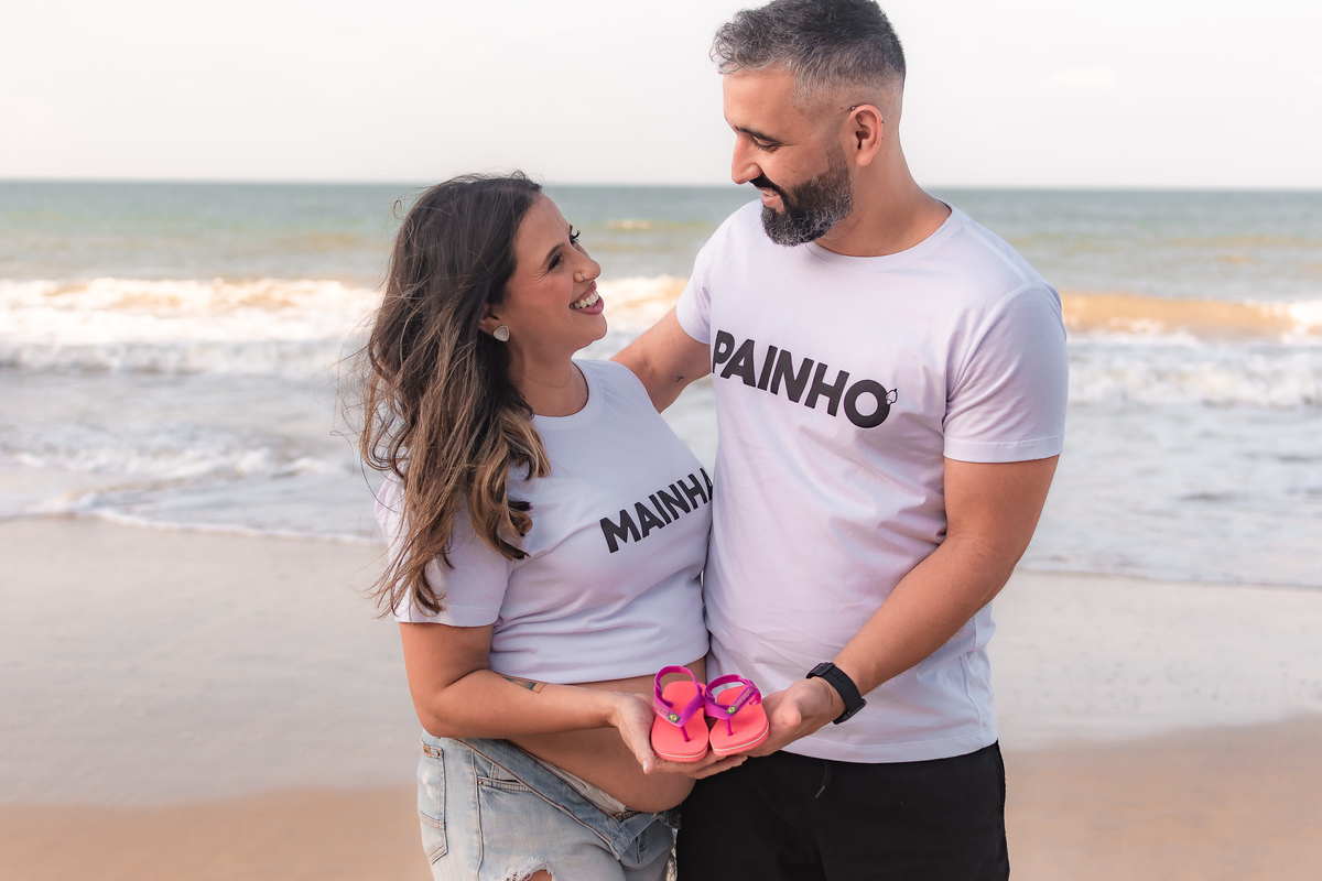 Vieram como sempre vieram à praia: à vontade, de chinelo (os mesmos que já têm versão em miniatura pronta para os pezinhos dela) e com camisetas que carregam, com orgulho, a maneira de falar de quem cresceu respirando a cultura do seu estado. Detalhes simples, mas carregados de identidade, daqueles que dizem tudo sem dizer nada.