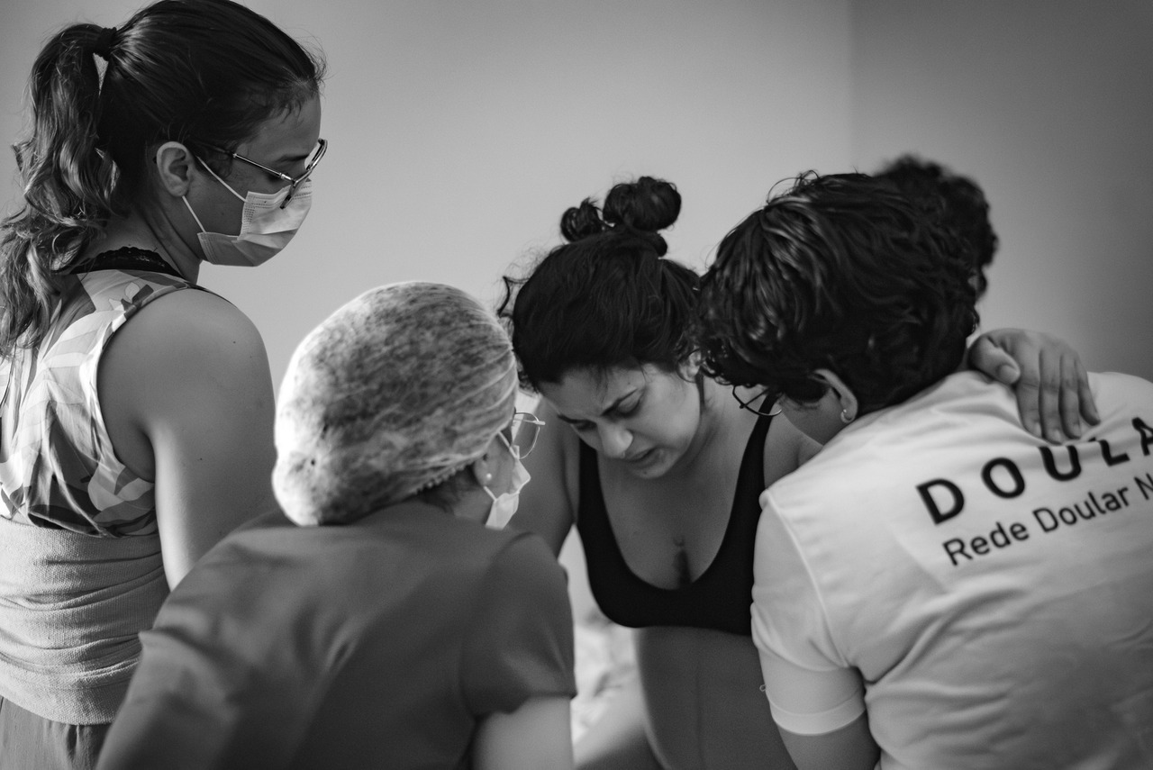 Parto domiciliar planejado, mulher assistida por enfermeira e doula.