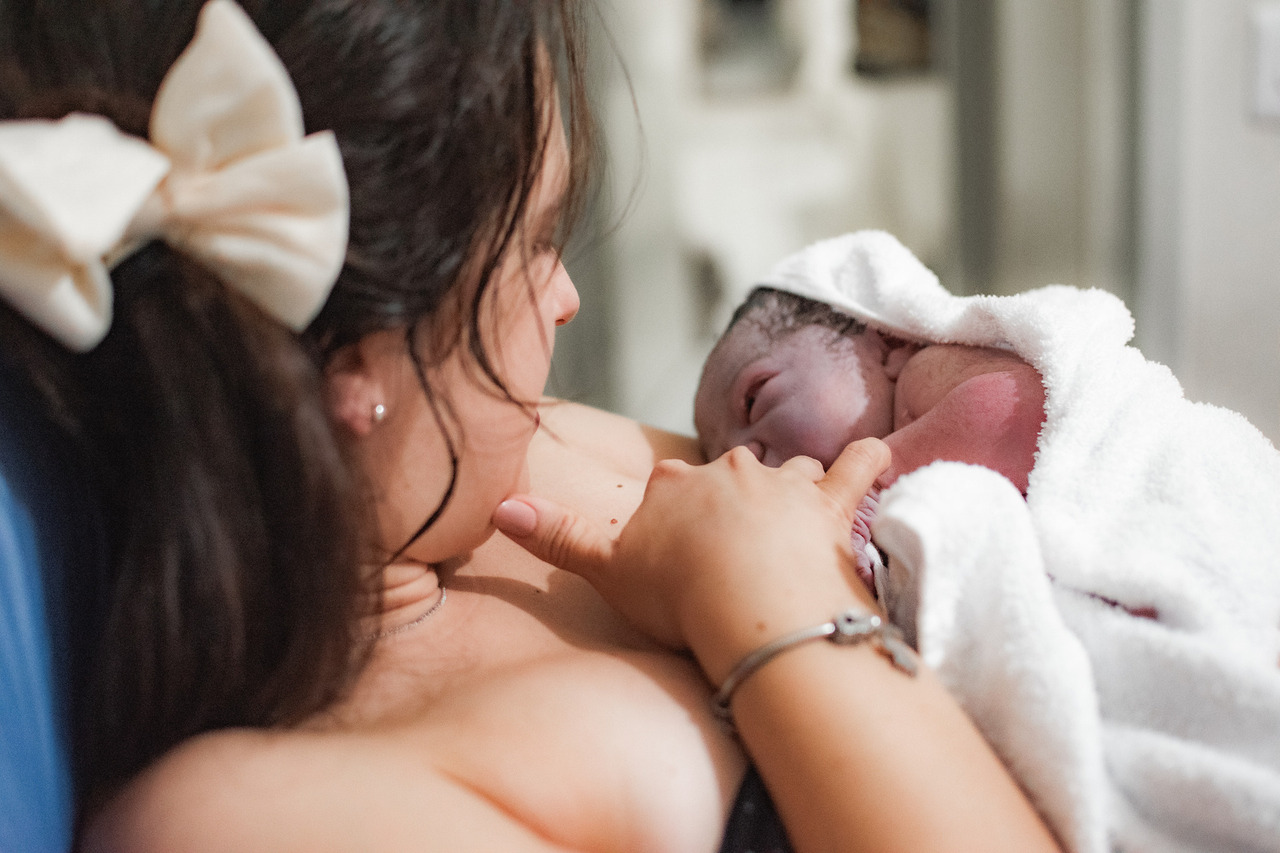 Bebê que acabou de nascer em um PDP em sua primeira mamada, nos primeiros minutos de vida.