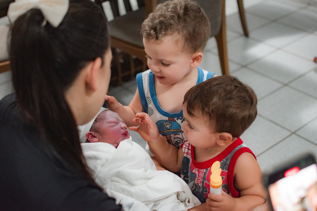 Irmãos mais velhos conhecendo o irmão que acabou de nascer em um PDP.