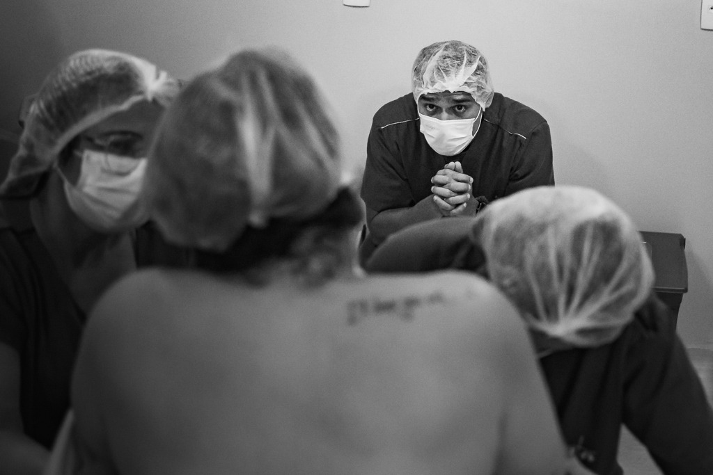 Durante o parto, o apoio de profissionais como doulas, enfermeiras obstétricas e do próprio acompanhante é fundamental. Ter um fotógrafo presente permite que esses momentos de apoio sejam registrados, desde o toque cuidadoso até as palavras de encorajamento. Essas imagens mostram a importância do suporte emocional e físico durante o parto, criando um retrato completo da experiência.