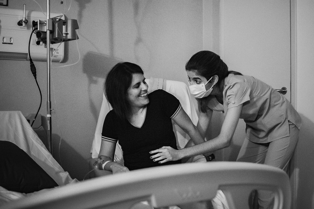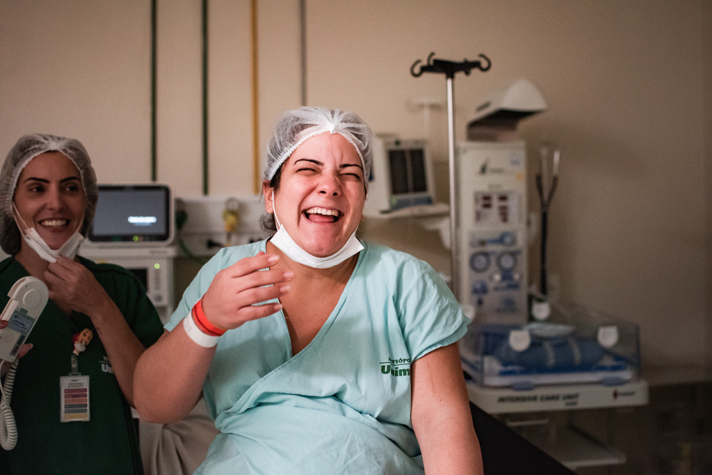 Foto mostrando uma mãe sorrindo durante trabalho de parto em um momento agradável.