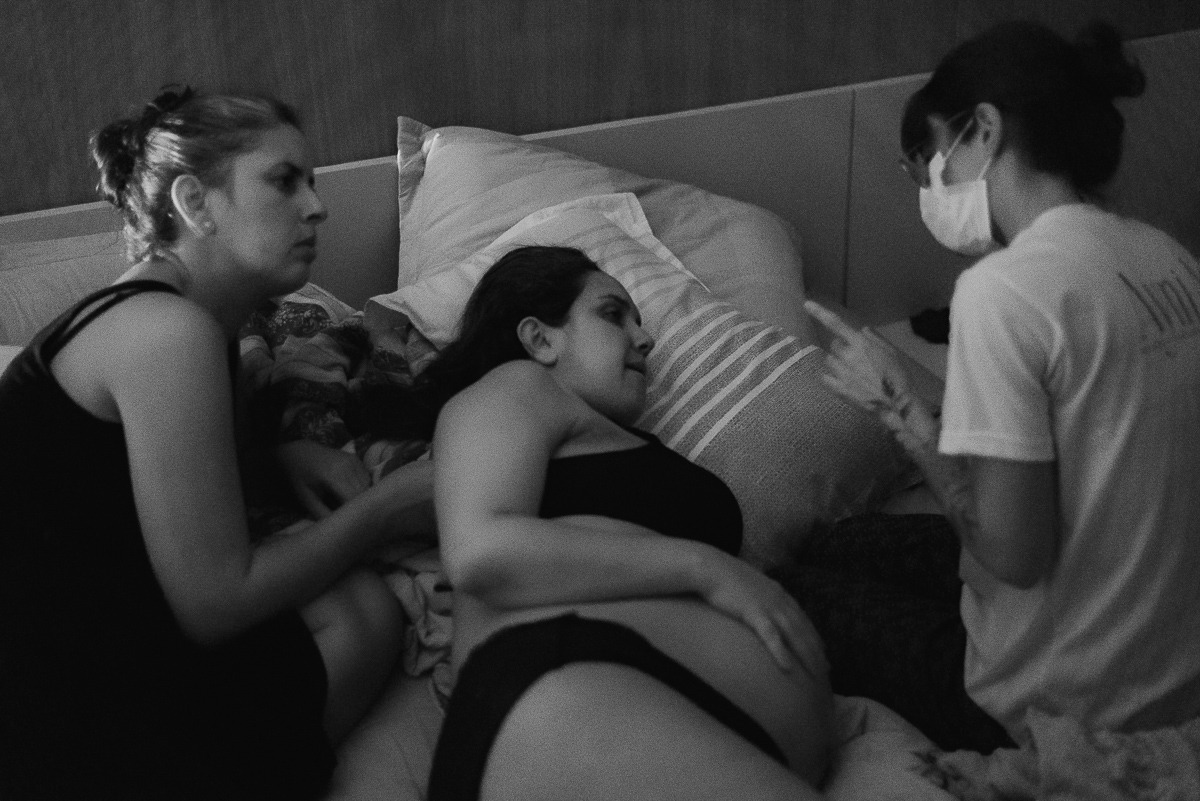 Mulher em trabalho de parto acolhida por uma doula e sua irmã durante trabalho de parto. (Foto por André Pontes)